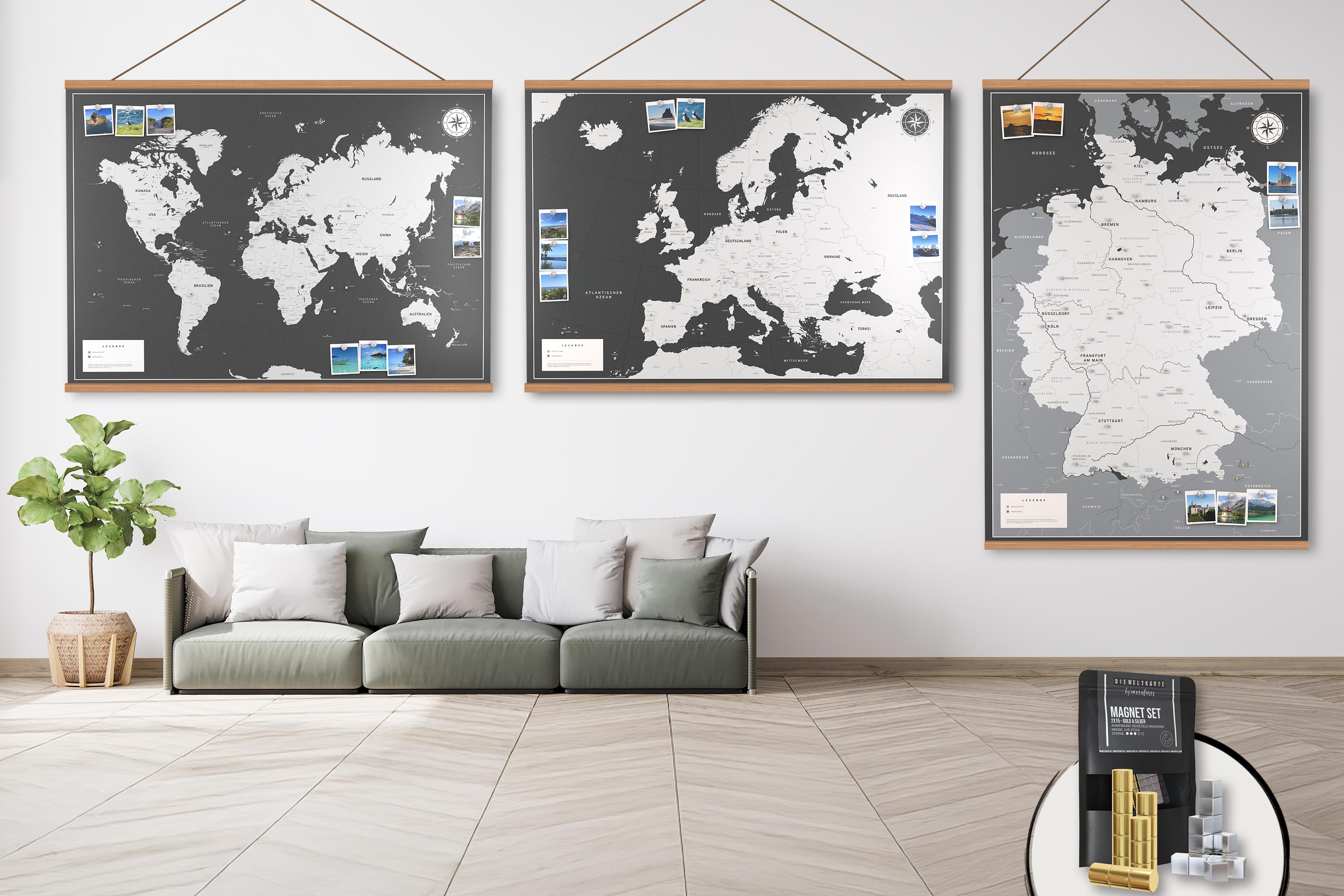 Entdecke neben der magnetischen Weltkarte zum pinnen auch die Europakarte und die Deutschlandkarte. Die Weltkarte ist keine Kork Weltkarte sondern eine hochwertige magnetische Weltkarte um alle deine Reiseziele zu markieren.
